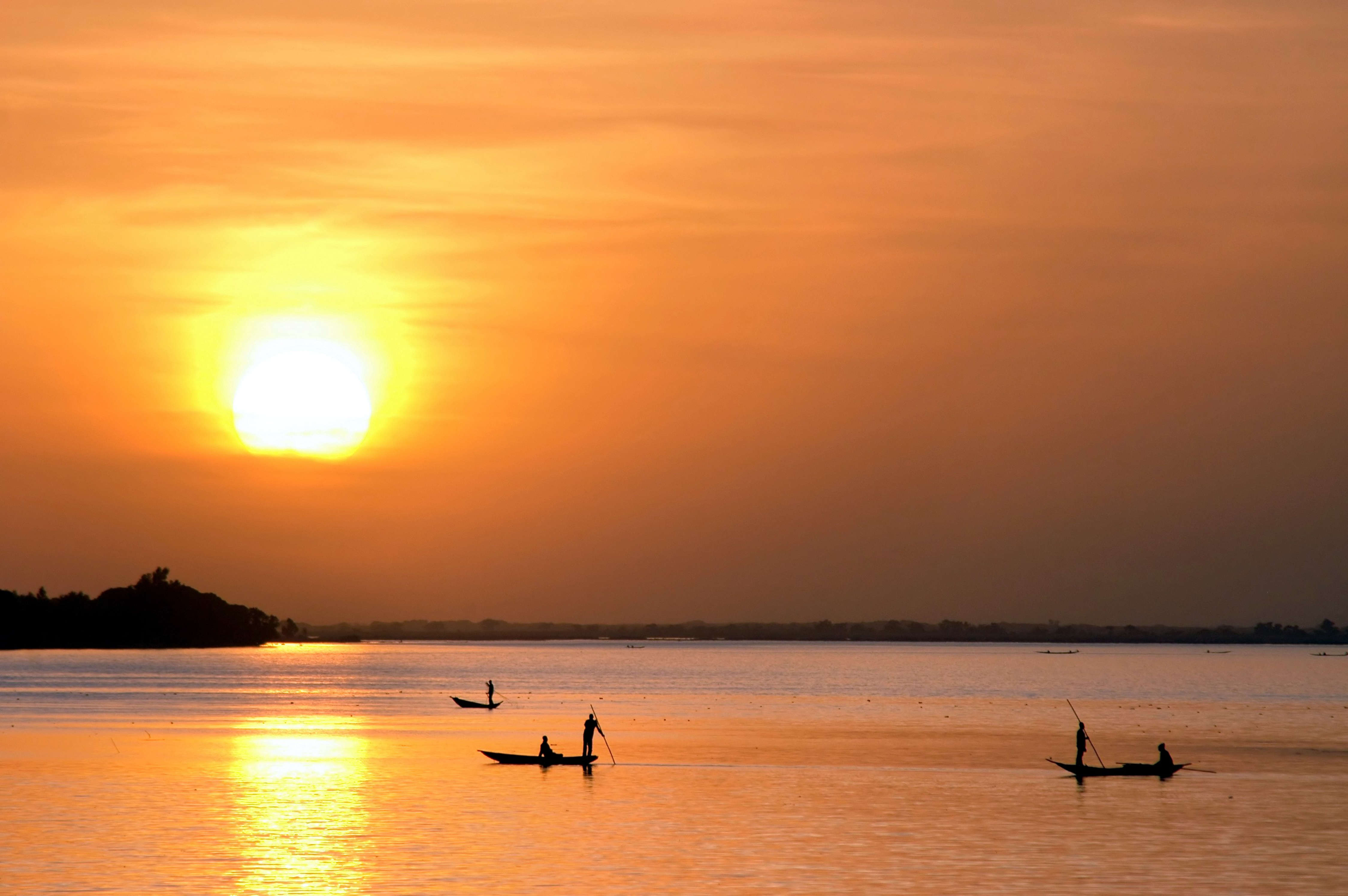 Horizontal of African fishermen in canoes at sunset