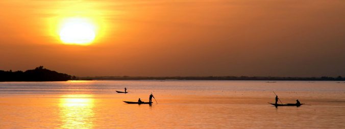 Horizontal of African fishermen in canoes at sunset